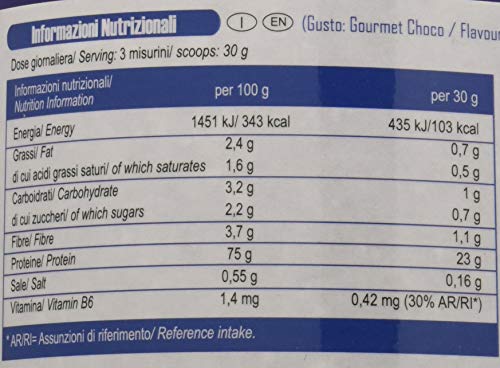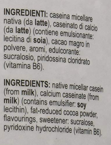 calcio caseinato (contiene latte), caseine micellari da proteine del latte (contiene soia); cacao magro in polvere; aromi, edulcorante: sucralosio; piridossina cloridrato (vitamina B6).