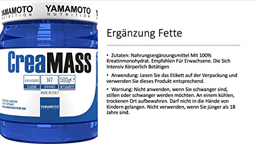 Specification: Yamamoto Nutrition CreaMASS integratore alimentare che apporta 100% creatina monoidrato gusto Neutro 500 g